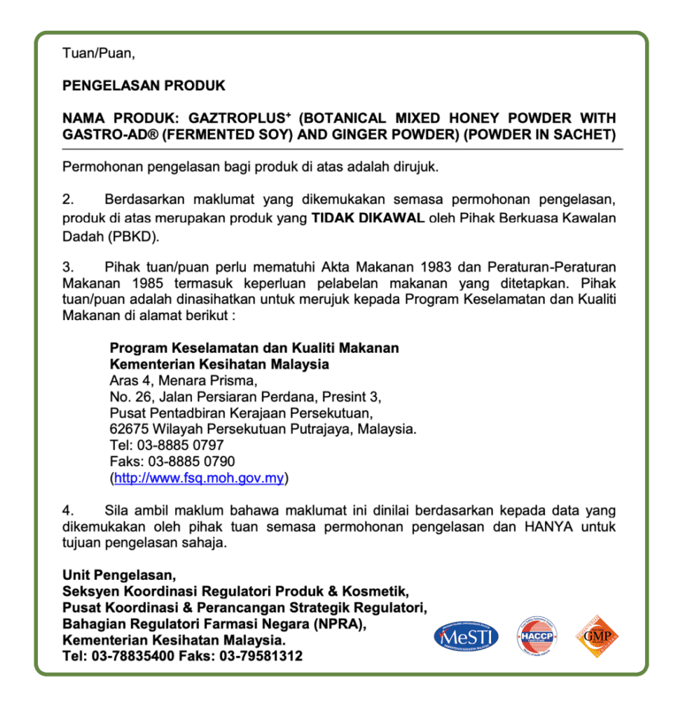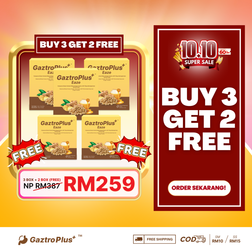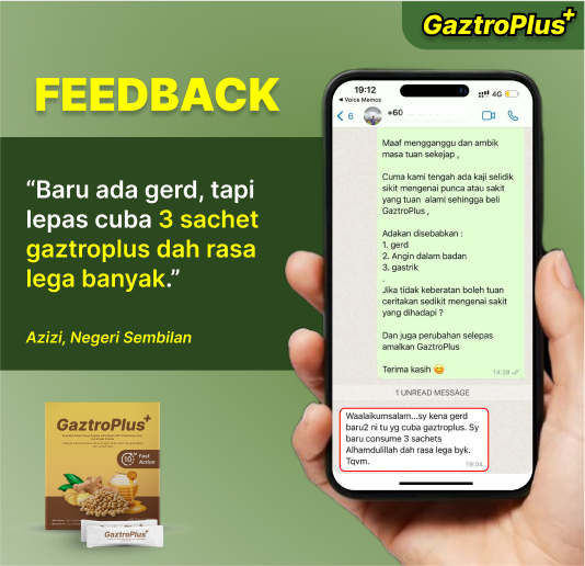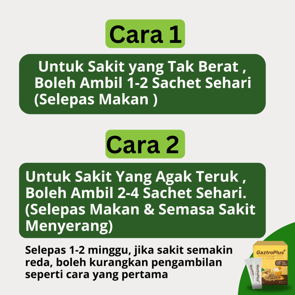Jika anda mengalami simptom GERD / Gastrik, anda boleh amalkan 1 – 4 sachet sehari (mengikut keperluan)