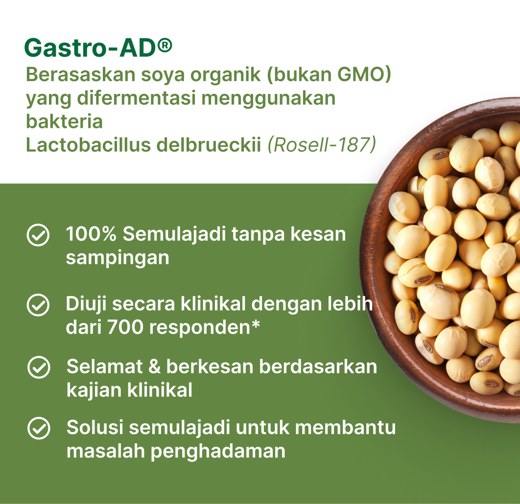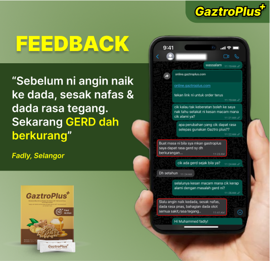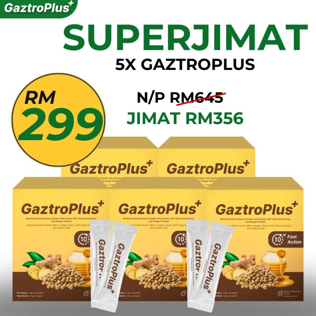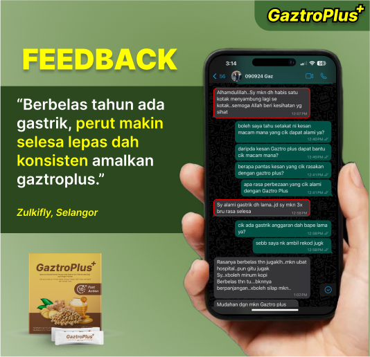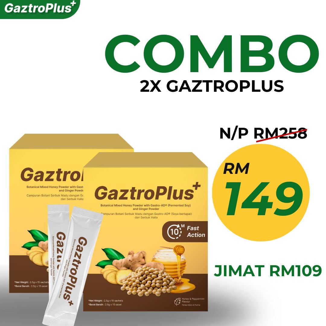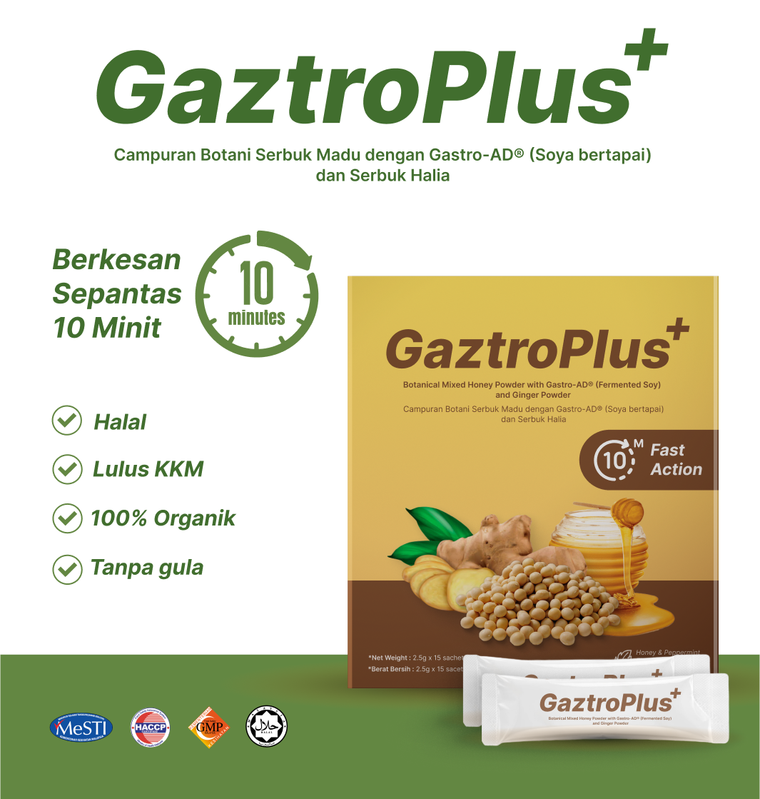 Gaztroplus adalah supplemen yang diformulasikan dari Gastro-AD®(berasaskan soya asli bukan GMO yang diperam dengan Probiotik), Madu & Pudina yang berfungsi secara efektif dalam menangani masalah GERD, Gastrik dan angin dalam badan. Kandungan ini membantu dengan pantas mengurangkan simptom seperti pedih ulu hati, serangan gastrik, sesak nafas, rasa nak muntah serta mempercepatkan proses penyembuhan.Gaztroplus alternatif semulajadi, selamat, dan terbukti berkesan berbanding ubat-ubatan.