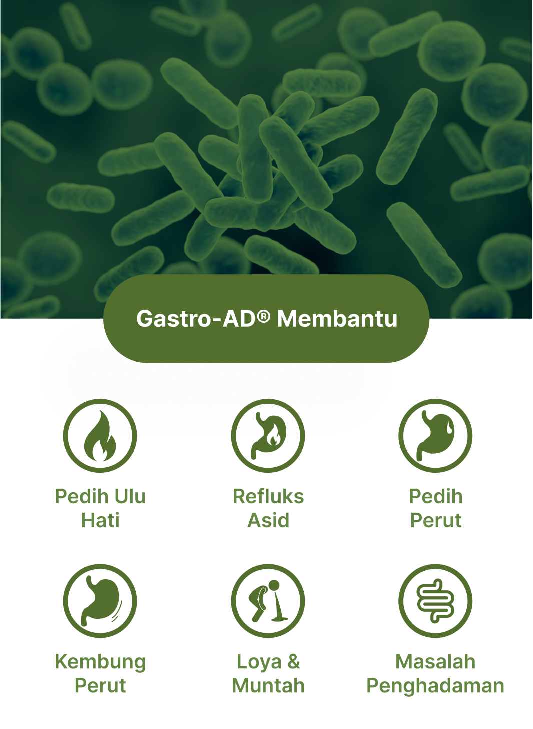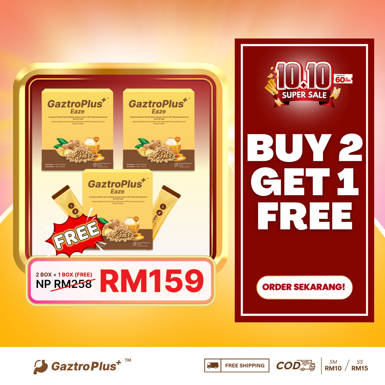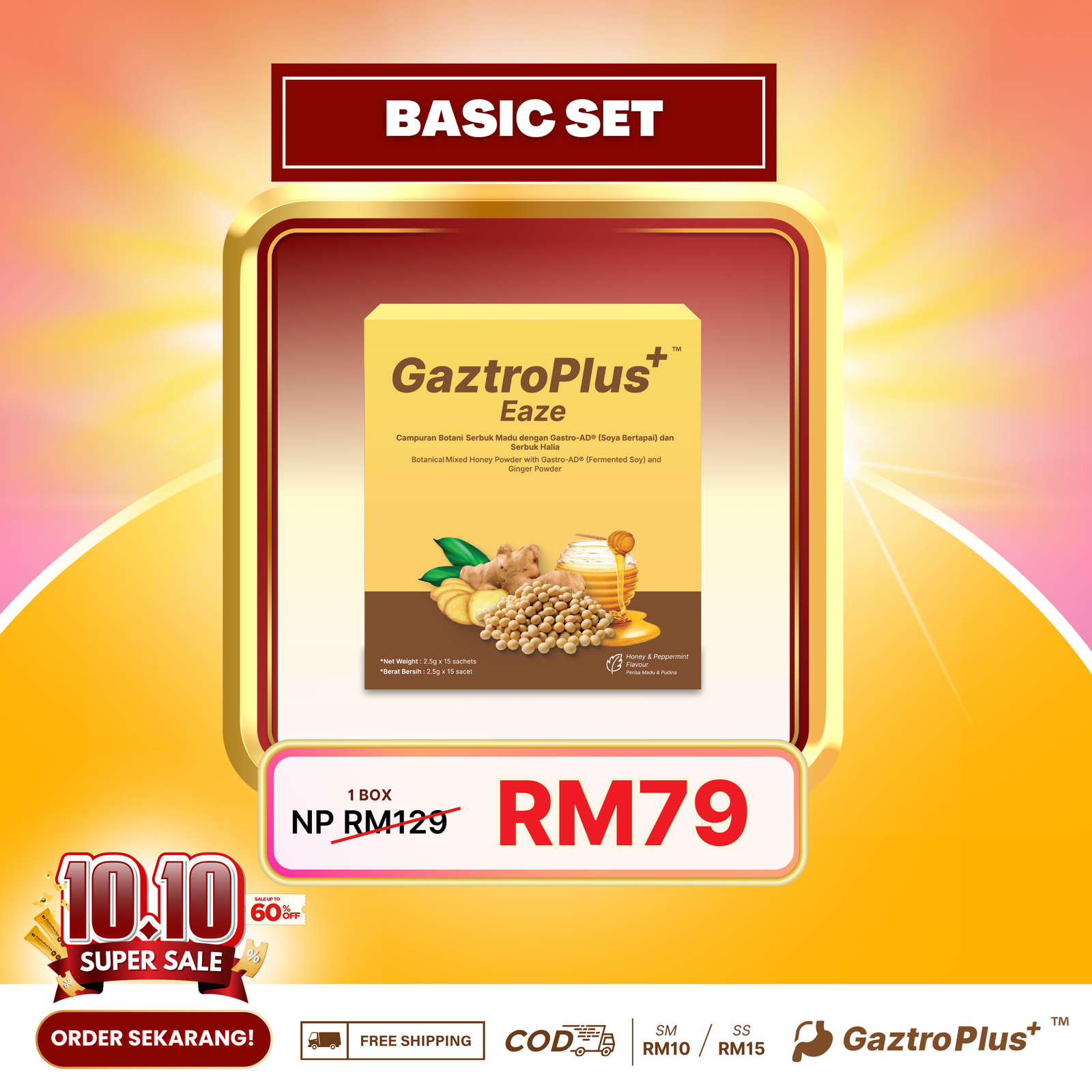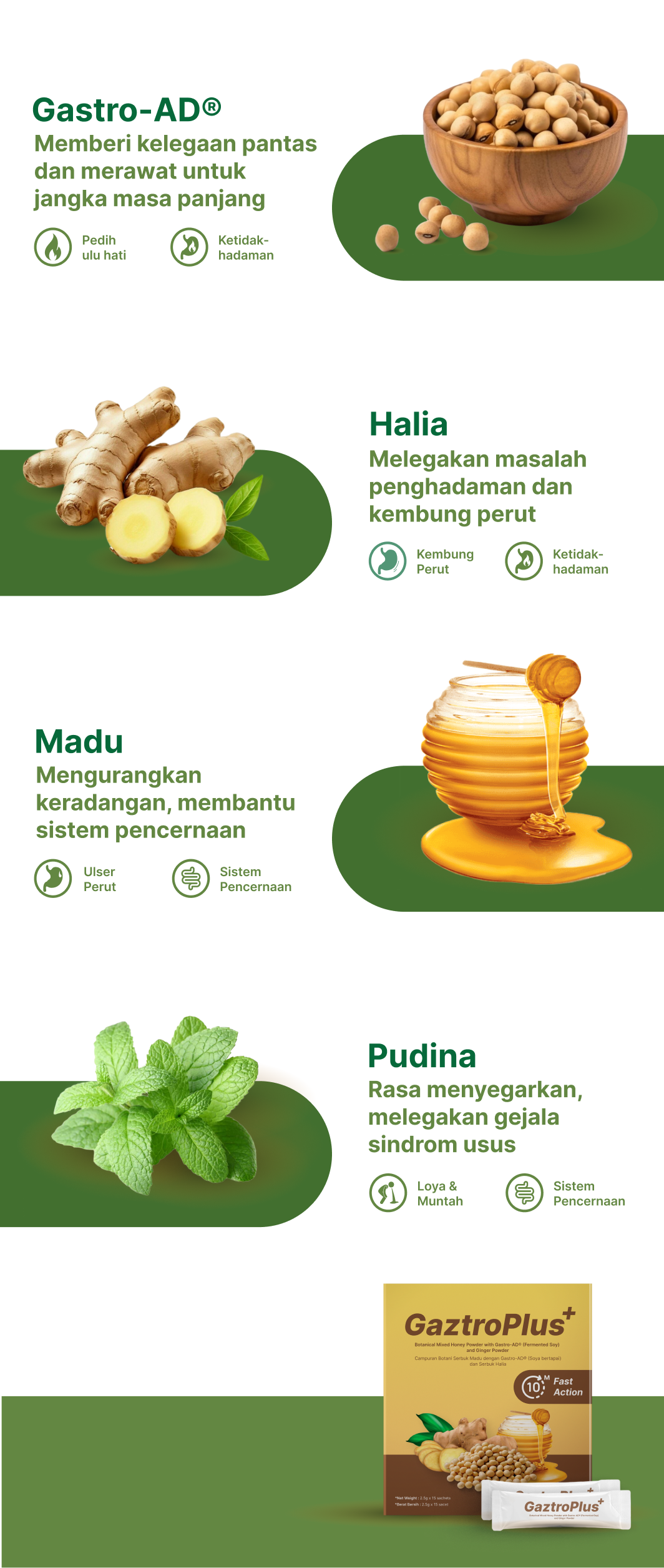 Gaztroplus adalah supplemen yang diformulasikan dari Gastro-AD®(berasaskan soya asli bukan GMO yang diperam dengan Probiotik), Madu & Pudina yang berfungsi secara efektif dalam menangani masalah GERD, Gastrik dan angin dalam badan. Kandungan ini membantu dengan pantas mengurangkan simptom seperti pedih ulu hati, serangan gastrik, sesak nafas, rasa nak muntah serta mempercepatkan proses penyembuhan.Gaztroplus alternatif semulajadi, selamat, dan terbukti berkesan berbanding ubat-ubatan.