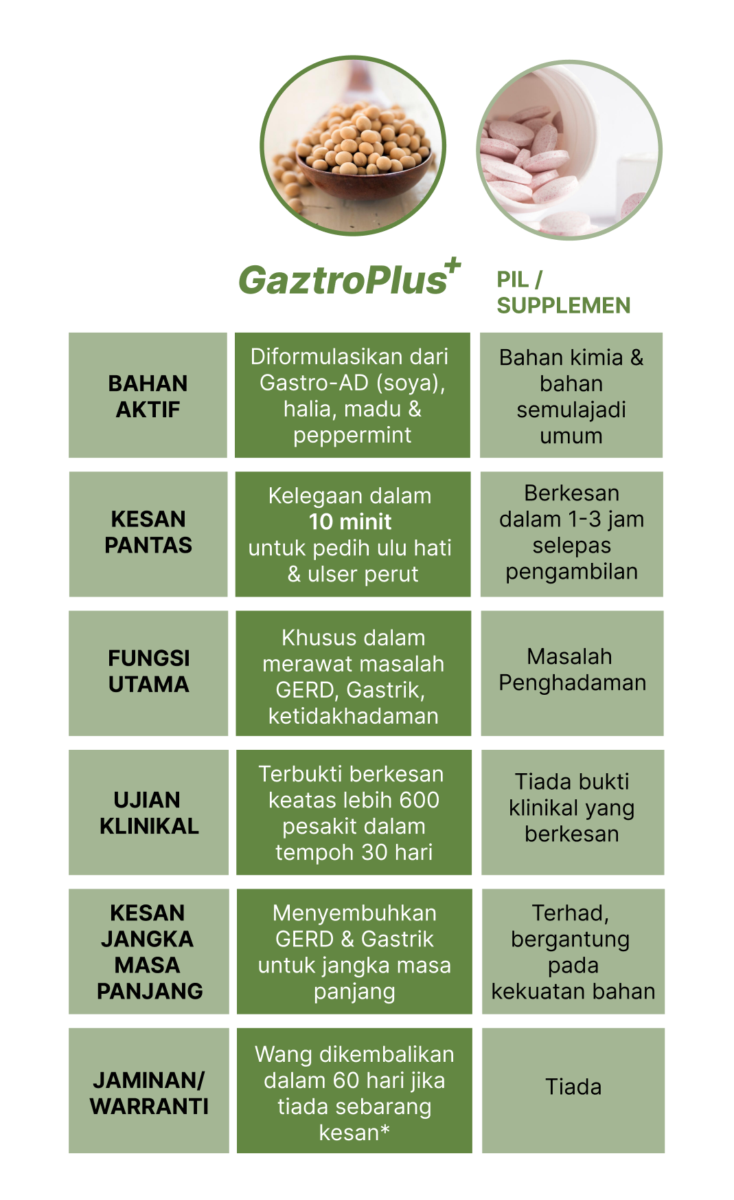 GaztroPlus Diformulasikan dengan Bahan Semulajadi 100% dan tiada kesan sampingan.